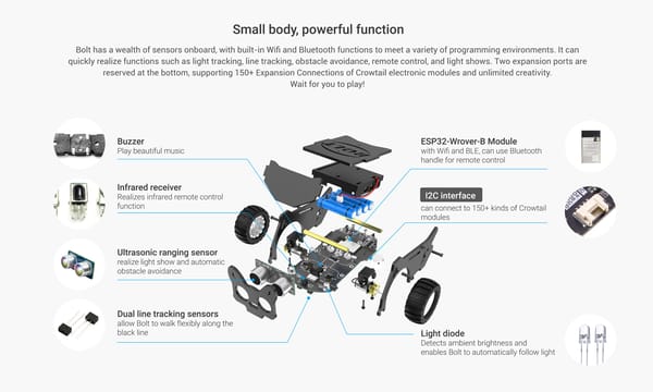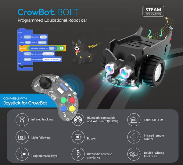 CrowBot BOLT is an open source smart programming robot car powered by an ESP32 chip. It has a wealth of sensors(such as a light sensor, ultrasonic sensor, and line Tracking Sensor), comes with Wifi and Bluetooth-compatible functions, and can meet a variety of programming environments like Letscode, Micropython, and Arduino. This programming robot kit can quickly realize functions such as light tracking, line tracking, obstacle avoidance, remote control, and light show. As an entry-level STEAM educational robot car toy, the cool and cute BOLT makes robot programming learning and teaching easy and fun. It comes with 16 lessons in three languages (Letscode, Arduino, MicroPython), provides rich graphical programming, and allows programming beginners to learn to program in the fun of creativity. It has reserved 2 expansion interfaces, which can be expanded and used with 150+ kinds of Crowtail modules. Unlimited creativity, waiting for you to discover!