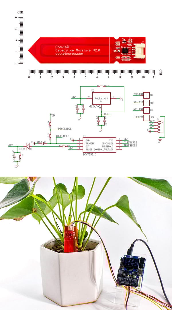 This is a capacitive soil moisture sensor, it can measure the soil moisture level of your plant by capacitive sensing. Compared with other types of moisture sensors, the capacitive soil moisture sensor is made of a corrosion-resistant material, which will provide a long service life. This moisture sensor can be used to detect the moisture of soil to monitor if the plants need water.